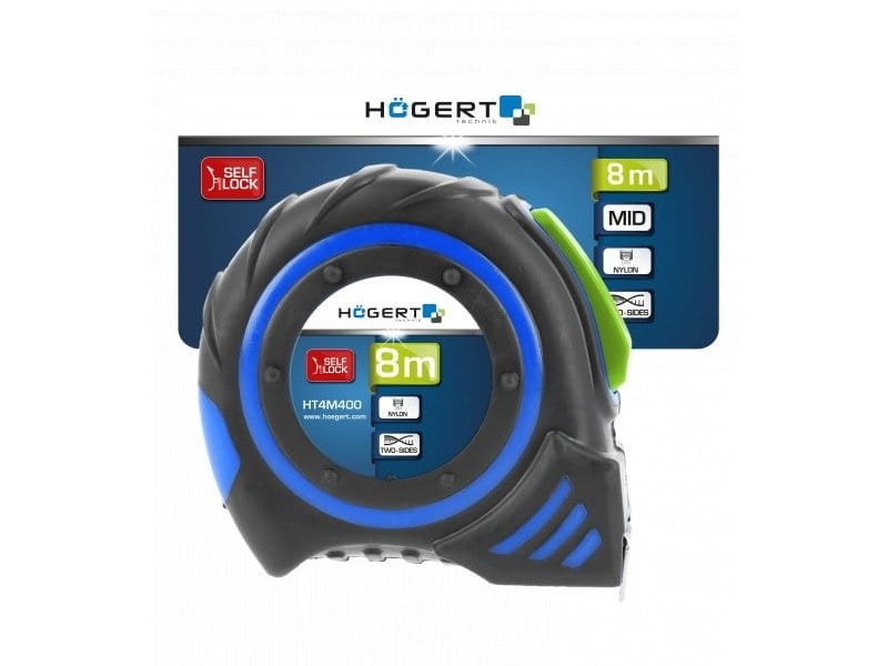 Miara zwijana HT4M402 ma 8 metrów długości i 25 milimetrów szerokości. Żółta taśma z czarnym nadrukiem zapewnia czytelny odczyt pomiaru, ponad to została pokryta nylonem dla zwiększonej trwałości i odporności przed ścieraniem się nadruku. Taśma jest dwustronnie zadrukowana, w układzie pionowym i poziomym. Zwijanie miary odbywa się za pomocą automatycznego mechanizmu. Ponad to blokada wysuniętej taśmy oraz zaczep hakowy z dwoma wbudowanymi magnesami ułatwiają dokonywanie pomiarów. Dodatkowo wykonane z antypoślizgowego materiału elementy umożliwiają wygodny i stabilny chwyt.