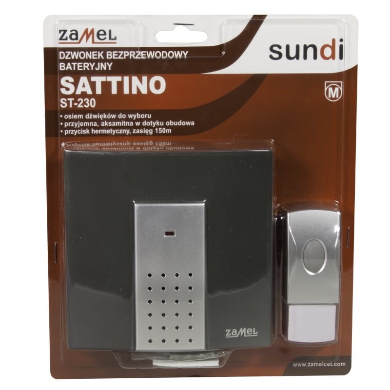 SATTINO (ST-230) to bezprzewodowy dzwonek nie wymagający instalacji - dzwonek oraz przycisk zasilane są bateryjnie z możliwością podłączenia zasilacza 6V DC. Wyróżnia się możliwością ustawienia indywidualnego kodu użytkownika (z 256 kodów), możliwością przypisania czterech przycisków do jednego dzwonka (z inną melodią) - możliwość rozpoznania miejsca przywołania oraz poręcznym przyciskiem z miejscem na wizytówkę. Charakteryzuje się designerskim wykonaniem, 8 przyjemnymi melodiami. Istnieje możliwość zwiększenia zasięgu działania dzwonka przez zastosowanie retransmitera typ RT-228. Obudowa przycisku przystosowana jest do pracy w zmiennych warunkach pogodowych (IP44). Idealnie sprawdzi się jako dzwonek do drzwi oraz wewnętrzne urządzenie przywoławcze (osoby wymagające opieki). Brak baterii w zestawie!