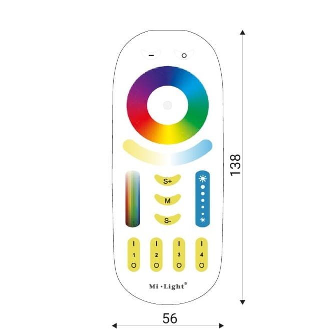 FUT092 to 4-strefowy pilot RGB + CCT do kontrolerów MiBoxer, wykorzystujący technologię transmisji bezprzewodowej 2,4G RF. Umożliwia regulację jasności i temperatury barwowej.