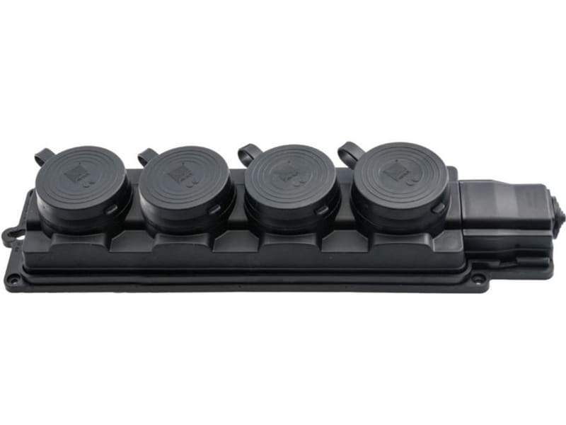 Przenośna listwa gumowa została wyposażona w cztery gniazda z klapką. Wykonana jest z najwyższej jakości materiałów. Posiada stopień ochrony IP44.