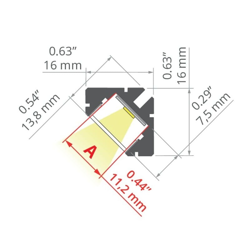 Profil 45-16 wyróżnia się małym gabarytem 16mm x 16mm oraz niską wagą. Kieruje światło pod kątem 45 stopni i przeznaczony jest do budowy opraw oświetleniowych kierunkowych oraz do osadzania na płaszczyznach i wewnętrznych narożnikach 90°. Do profilu nie jest dołączona przesłona!