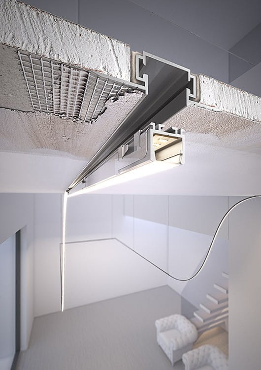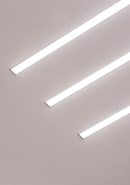 - linia światła we wbudowanej oprawie bez widocznych elementów aluminiowych