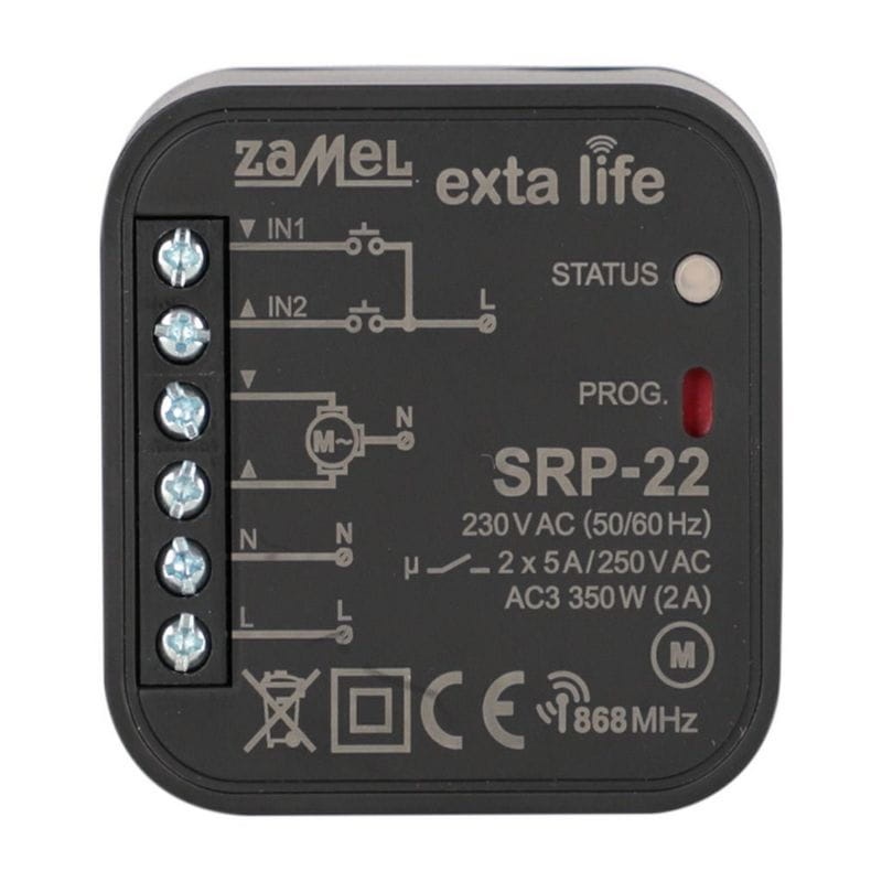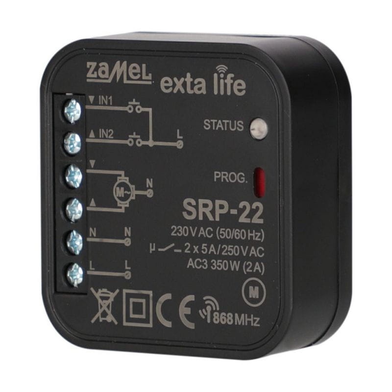 SRP-22 to sterownik rolet przeznaczony do zarządzania roletami okiennymi oraz innymi urządzeniami z silnikami jednofazowymi 230 VAC. Umożliwia sterowanie zarówno bezprzewodowo, za pomocą nadajników i kontrolera exta life, jak i przewodowo, poprzez przyciski żaluzjowe odbijające. Wejścia IN1 i IN2 można konfigurować w aplikacji mobilnej, wybierając tryb sterowania lokalnego lub centralnego. Dwukierunkowa komunikacja zapewnia możliwość monitorowania stanu rolety w aplikacji oraz zdalną parametryzację sterownika. Algorytm kodowania ramek gwarantuje bezpieczeństwo, co jest kluczowe w przypadku rolet i bram garażowych. SRP-22 obsługuje zdalną aktualizację oprogramowania i możliwość zdefiniowania czterech ustawień ulubionych. Może być sterowany z kilku nadajników jednocześnie, zapewniając elastyczność i wygodę użytkowania.