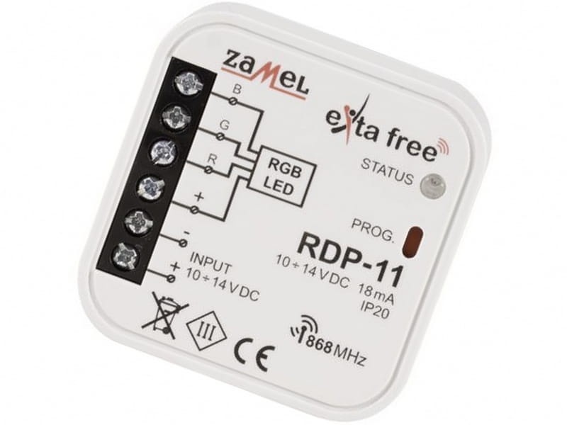 Sterownik RDP-11 przeznaczony jest do współpracy ze standardowymi lampami LED z diodami RGB. Współpracuje z nadajnikami bezprzewodowego systemu sterowania EXTA FREE oraz dedykowanym pilotem dotykowym P-260. Oprócz funkcji klasycznego ściemniacza, urządzenie posiada możliwość wyboru 1 z 10 kolorów oraz ich automatyczną zmianę. Komunikuje się radiowo na częstotliwości 868 MHz. Małe gabaryty umożliwiają łatwy montaż w puszce ∅=60 mm.