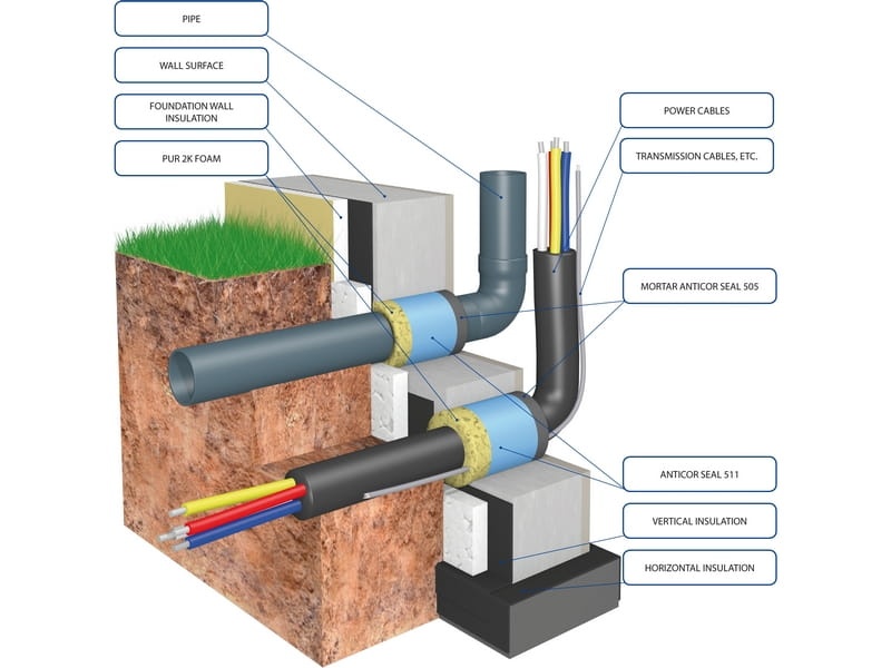 - uszczelnienie i wypełnianie przepustów kablowych i rurowych w podziemnych częściach budowli przed wilgocią i wodą pod ciśnieniem.