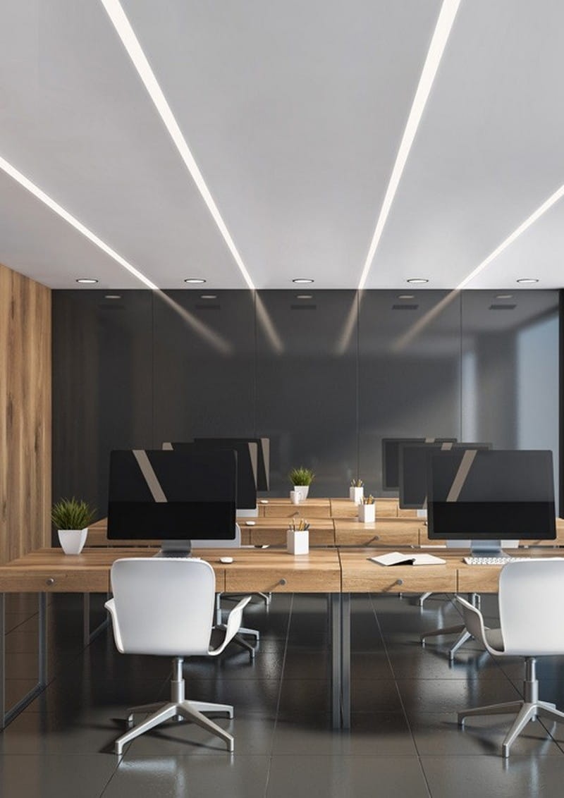 - Montaż „od dołu” daje możliwość projektowania opraw w suficie „od ściany do ściany”