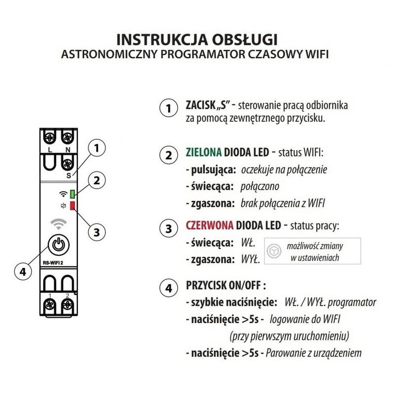 RS-WIFI2 to programator czasowy bazujący na zegarze astronomicznym. Urządzenie służy do włączania oraz wyłączania oświetlenia lub innych połączonych z programatorem odbiorników elektrycznych. Dzięki funkcji zegara astronomicznego, programator działa zgodnie z porami wschodu oraz zachodu słońca, model RS-WIFI2 uwzględnia także informacje o szerokości geograficznej miejsca instalacji, więc dane na których działa są bardzo dokładne. Za wygodę użytkowania programatora odpowiada aplikacja Smart life (dostępna na Android i iOS), która pokieruje Cię w celu szybkiej i przyjemnej konfiguracji urządzenia, dzięki zdalnie, w każdym miejscu na świecie, włączysz lub wyłączysz swoje urządzenie, jedynym warunkiem jest stałe podłączenie programatora do sieci WiFi z dostępem do Internetu.