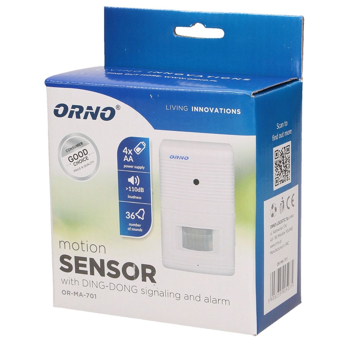 Bezprzewodowy czujnik ruchu z sygnalizacją i alarmem wychwytuje ruch z odległości 5 metrów, kąt widzenia w poziomie 100°, poziom dźwięku 100 dB, learning system (automatyczne logowanie). Montaż na ścianie (w zestawie ruchoma głowica, która umożliwia regulację kąta nachylenia czujki) lub jako urządzenie wolnostojące. Najdogodniejsze miejsce montażu czujki to wysokość między 1,5 a 2 m. Umożliwia poprawę bezpieczeństwa i kontrolę dostępu do pomieszczeń takich jak garaż, sklep, magazyn. Montując alarm należy pamiętać, że czujka ruchu aktywowana jest poprzez zmiany promieniowania cieplnego.