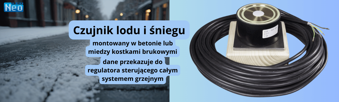 Czujnik lodu i śniegu do montażu na podjazdach, schodach i ciągach komunikacyjnych, z przewodem o długości 15m. Urządzenie wykrywa wilgoć oraz mierzy temperaturę, przekazując dane do regulatora, który zarządza systemem grzewczym. Montaż możliwy jest w betonie lub między kostkami brukowymi.