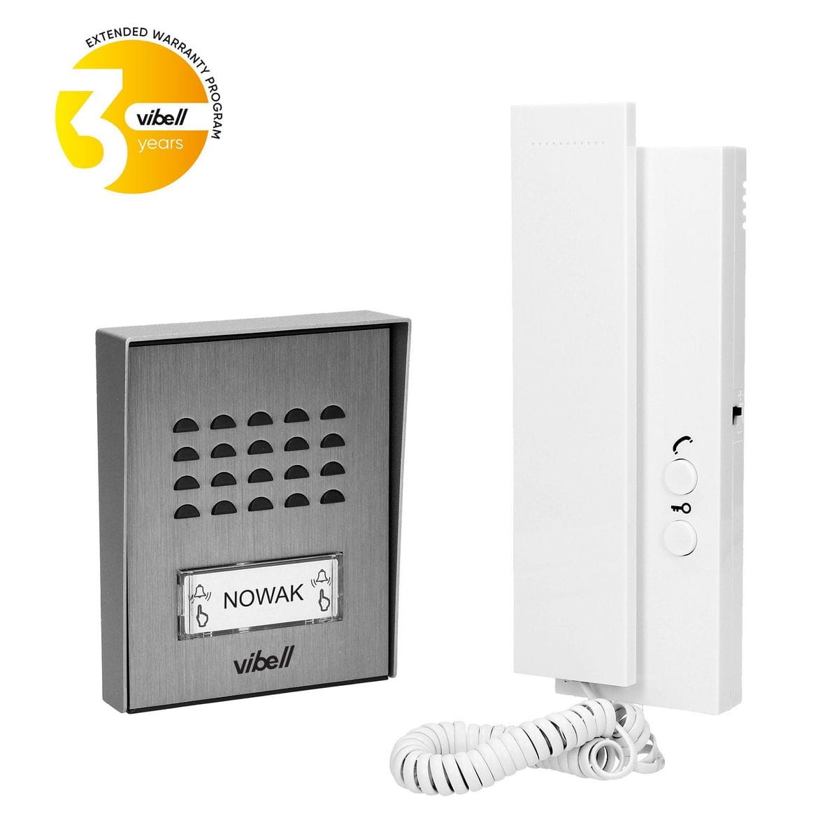 Zestaw domofonowy 2-żyłowy, może być podłączony na zwykłej instalacji dzwonkowej, montaż natynkowy, daszek ochronny w zestawie, podświetlane miejsce na nazwisko, możliwość stworzenia systemu 2-rodzinnego, dodatkowe sterowanie bramą, dwustopniowa regulacja głośności dzwonka, funkcja interkomu po zastosowaniu dodatkowego unifonu, elektrozaczep (zalecany z funkcją pamięci) nie wymaga dodatkowego zasilania.