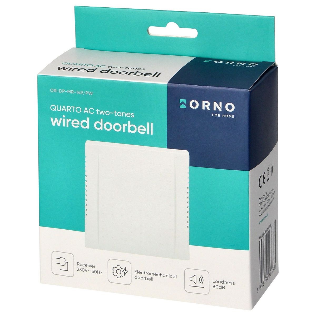 Dzwonek dwutonowy QUARTO AC to prosty w montażu i wygodny w użyciu śnieżno biały dzwonek elektromechaniczny z funkcją przeciwblokady łącznika. Przeznaczony do zastosowana w pomieszczeniach zamkniętych z instalacją dzwonkową prądu zmiennego 230V, np. w domu, mieszkaniu, sklepie itd.