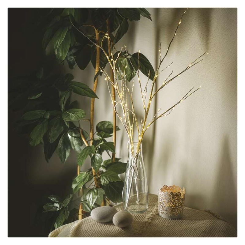 Gałązki dekoracyjne LED nawiązujące do naturalnej brzozy tworzą subtelną i elegancką iluminację. Dzięki 100 diodom LED, zasilaniu bateryjnemu oraz timerowi 6/18h stanowią praktyczny i efektowny element dekoracyjny do wnętrz i przestrzeni zewnętrznych.