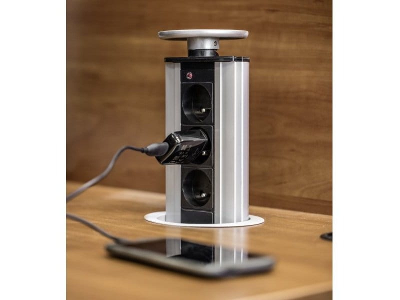 Gniazdo meblowe AE-BPW3GU-80 to zestaw trzech gniazd sieciowych z uziemieniem i przesłonami torów prądowych w okrągłej obudowie chowanej w blat. Taka forma pozwala zadbać o organizację oraz estetykę przestrzeni. Urządzenie przeznaczone jest do montażu w blatach, biurkach oraz stołach, z powodzeniem znajdzie zastosowanie w salach konferencyjnych, gabinecie, a także w kuchni.