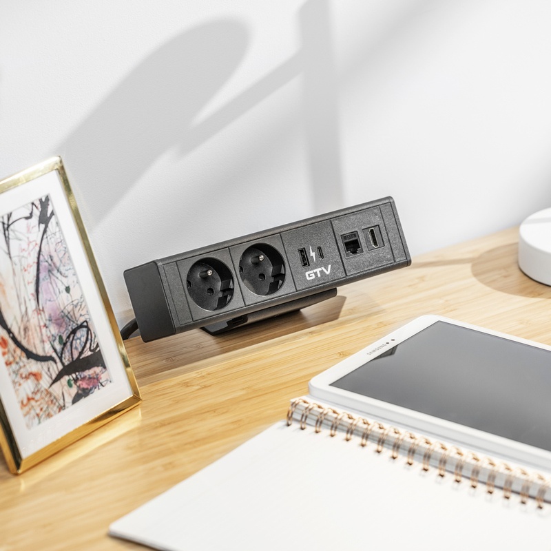 Gniazdo meblowe BAR ładowarka USB przewód 1,5m 2x2P+Z 2xUSB 1xHDMI 1xRJ45 czarne
