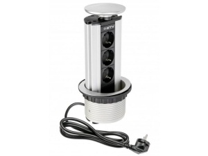 Gniazdo meblowe AE-BPW3GS-20 to zestaw trzech gniazd sieciowych z uziemieniem i przesłonami torów prądowych w okrągłej obudowie chowanej w blat. Taka forma pozwala zadbać o organizację oraz estetykę przestrzeni. Urządzenie przeznaczone jest do montażu w blatach, biurkach oraz stołach, z powodzeniem znajdzie zastosowanie w salach konferencyjnych, gabinecie oraz pokojach uczniów.