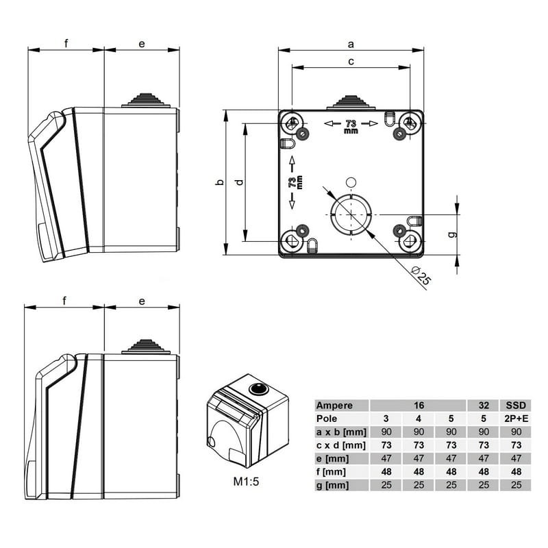 Gniazdo natynkowe przelotowe 3P+N+E 32A IP44 5P białe 875-6V PCE