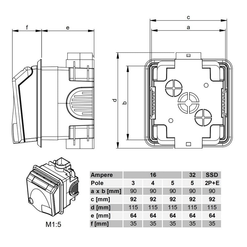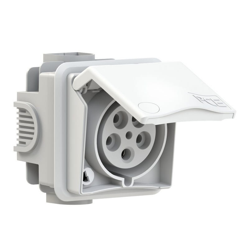 Gniazdo podtynkowe przelotowe 32A 5P 6h IP44 marki PCE, firmy która od lat zaopatruje fachowców najwyższej jakości osprzęt siłowy. Dzięki klasie szczelności na poziomie IP44 produkt można swobodnie wykorzystać na zewnątrz budynków.
