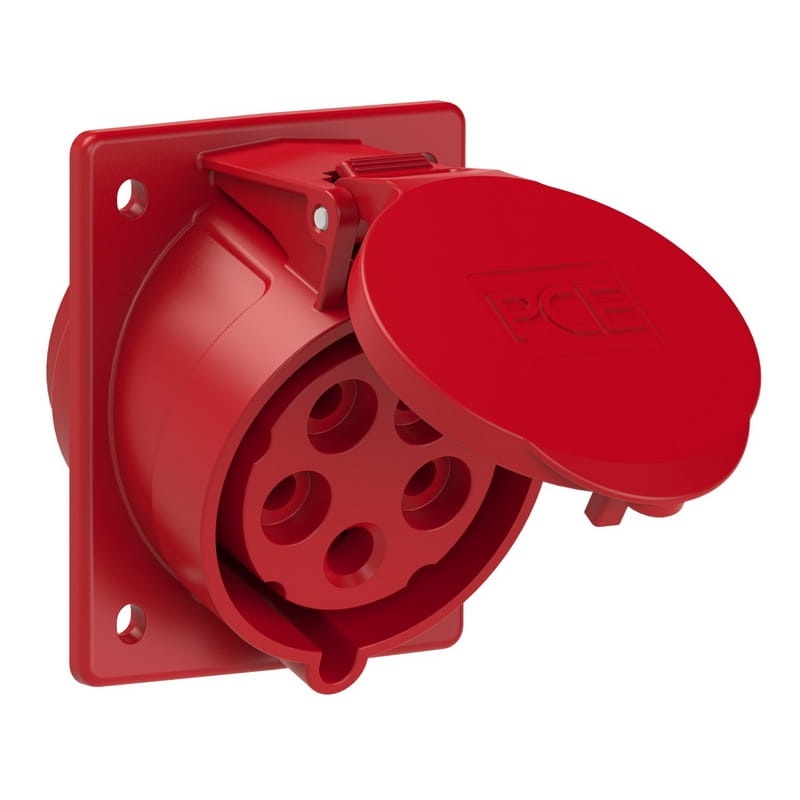Gniazdo tablicowe skośne 32A 5P 400V 6h IP44 do montażu powierzchniowego marki PCE, firmy która od lat zaopatruje fachowców najwyższej jakości osprzęt siłowy. Dzięki klasie szczelności na poziomie IP44 produkt można swobodnie wykorzystać na zewnątrz budynków.