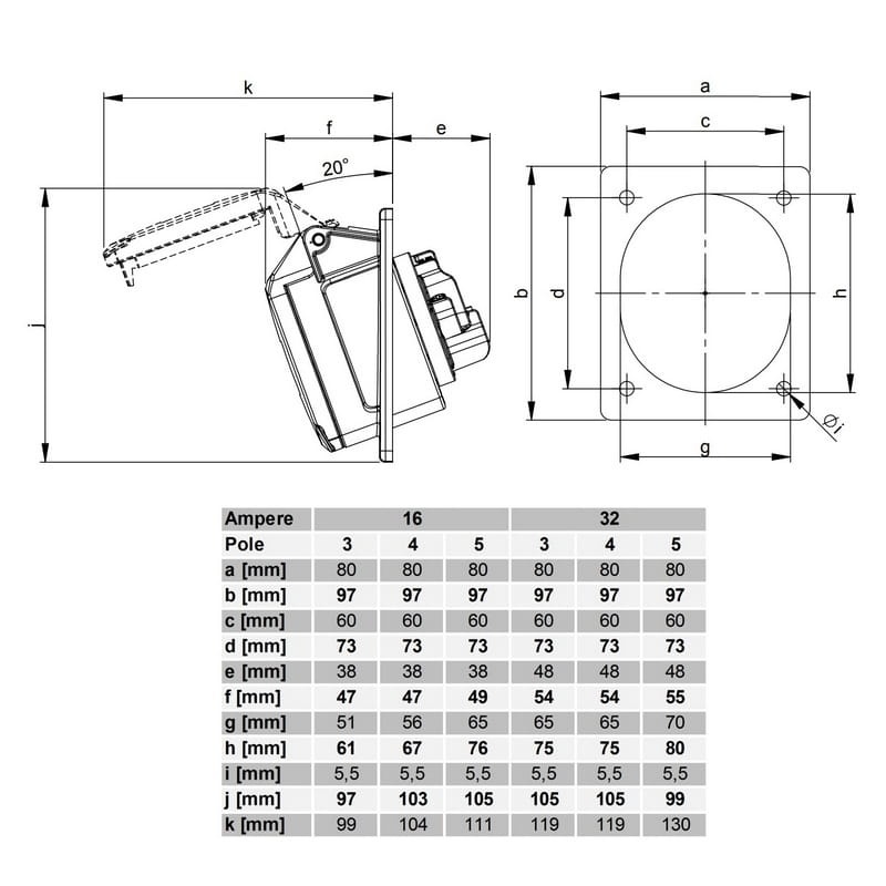 Gniazdo tablicowe skośne 3P+N+E 32A IP44 5P 425-6 PCE