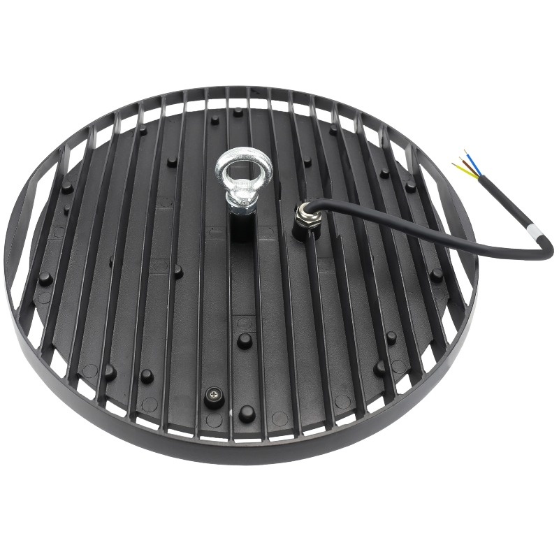 Obudowa oprawy została wykonana z aluminium oraz elementów z tworzywa PC, co zapewnia odpowiednią trwałość i odporność na warunki przemysłowe. Czarna konstrukcja o średnicy 303 mm i wysokości 90 mm jest przystosowana do montażu zwieszanego, dzięki czemu oprawa może być instalowana na dużych wysokościach w halach i magazynach.