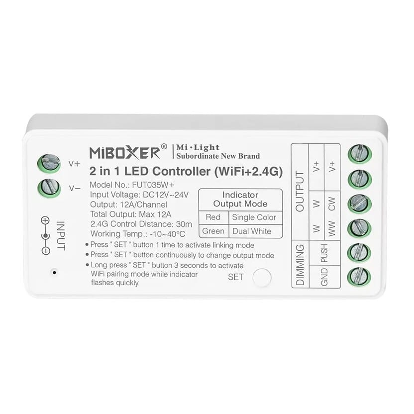 Kontroler LED MiBoxer FUT035W+ pojedynczy kolor + podwójny biały CCT 12-24VDC / 2x12A (total max. 12A) IP20 sterowany za pomocą transmisji bezprzewodowej WiFi [IEEE 802.11b/g/n 2,4 GHz], bluetooth 4.2 lub pilota 2,4 GHz. Maksymalny zasięg sterowania do 30 m. Współpracuje z dedykowaną aplikacją sterująca na smartfony – Tuya Smart. Możliwość kontroli głosowej Alexa lub Google Home Assistant.