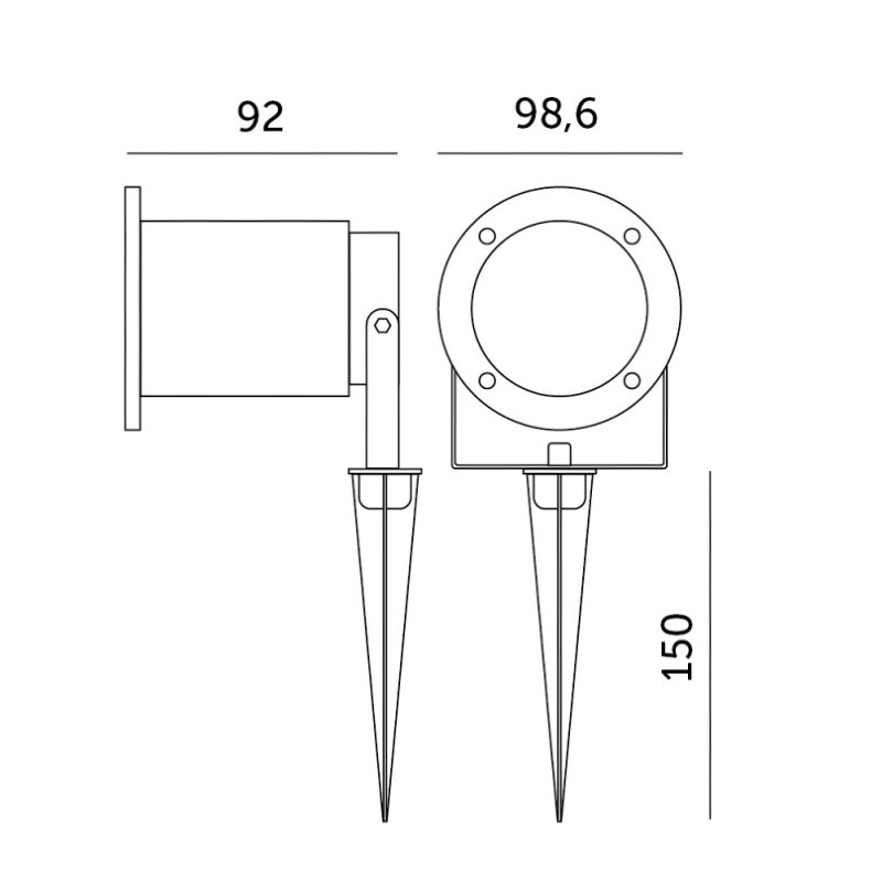 - Wymiary [mm]: Ø98,6 × 92 × 150 (wysokość całkowita z kolcem)