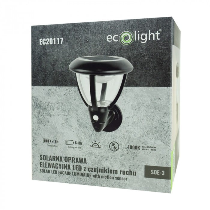 Lampa solarna elewacyjna LED SOE-3 to wydajne i energooszczędne oświetlenie zewnętrzne, które sprawdzi się doskonale na ścianach budynków, tarasach czy ogrodach. Wyposażona w trwały akumulator Li-ion o pojemności 3.7V 1200mAh 18650 oraz efektywny panel solarny o mocy 5V 0.55W, zapewniający niezależne zasilanie za pomocą energii słonecznej. Lampa emituje przyjemne światło o barwie 4000K, które doskonale oświetli otoczenie. Posiada imponujący strumień świetlny na poziomie 95lm, zapewniający odpowiednie oświetlenie nawet w ciemniejszych warunkach. Konstrukcja z wysokiej jakości materiałów ABS i PC oraz stopień szczelności IP44 gwarantują trwałość i odporność na warunki atmosferyczne. Dodatkowo, wyposażona jest w czujnik zmierzchu i czujnik ruchu PIR, co sprawia, że lampa automatycznie włącza się po zmroku oraz w momencie wykrycia ruchu, co zwiększa jej funkcjonalność i oszczędza energię. Długi czas pracy wynoszący od 6 do 8 godzin oraz krótki czas ładowania 6 godzin sprawiają, że lampa jest wygodnym i ekologicznym rozwiązaniem. Produkt objęty jest gwarancją producenta na okres 2 lat, co daje pewność co do jego jakości i niezawodności.
