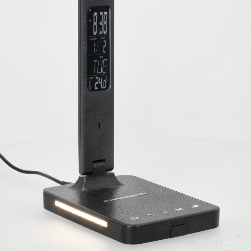 Model NOBLITE 7W to lampka biurkowa LED o nowoczesnym designie i zaawansowanej funkcjonalności. Wyposażona w wyświetlacz LCD z datą, godziną i temperaturą (zasilany baterią CR1632 – w zestawie), funkcję budzika i drzemki, oraz możliwość zmiany barwy światła w zakresie 3000–6000K i ściemniania.