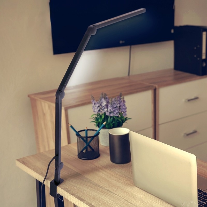 TENUIX FOLD 20W 3CCT to stylowa i praktyczna lampka biurkowa LED z dwoma elementami świecącymi. Oferuje ściemnianie, wybór trzech barw światła (3000/4000/6500 K) oraz trójprzegubową regulację ułatwiającą precyzyjne ustawienie strumienia. Montaż do blatu zapewnia stabilność i oszczędność miejsca na biurku.
