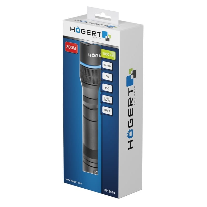 Latarka LED 1000 lm z funkcją zoom i wodoodporną obudową (IPX7). Oferuje cztery tryby pracy i jest zasilana akumulatorem 2000 mAh ładowanym przez USB-C. Solidna aluminiowa konstrukcja, pasek na rękę i profilowana obudowa zapewniają wygodę użytkowania. Brak baterii w zestawie!