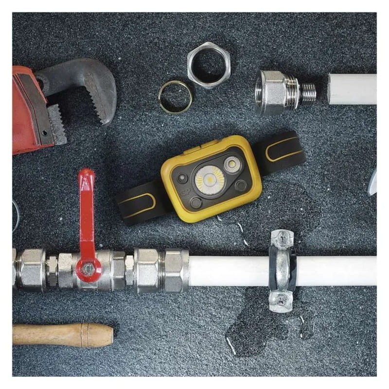 Lampa czołowa GP Discovery CHW53 to niezawodny partner w pracy w ciemności. Oferuje 6 trybów oświetlenia, w tym tryby białego i czerwonego światła, z zasięgiem do 90 m i strumieniem świetlnym 280 lm. Czerwone światło pozwala na subtelne oświetlenie bez oślepiania. Dzięki wytrzymałemu korpusowi odpornemu na upadki z 5m oraz wodoodporności IPX5, sprawdzi się w trudnych warunkach. Czołówka wyposażona jest w regulowany pasek, łatwo montujący się do kasku, oraz możliwość pochylania korpusu do 60°, by precyzyjnie oświetlić obszar roboczy. Działa do 25 godzin na 3 bateriach AAA.