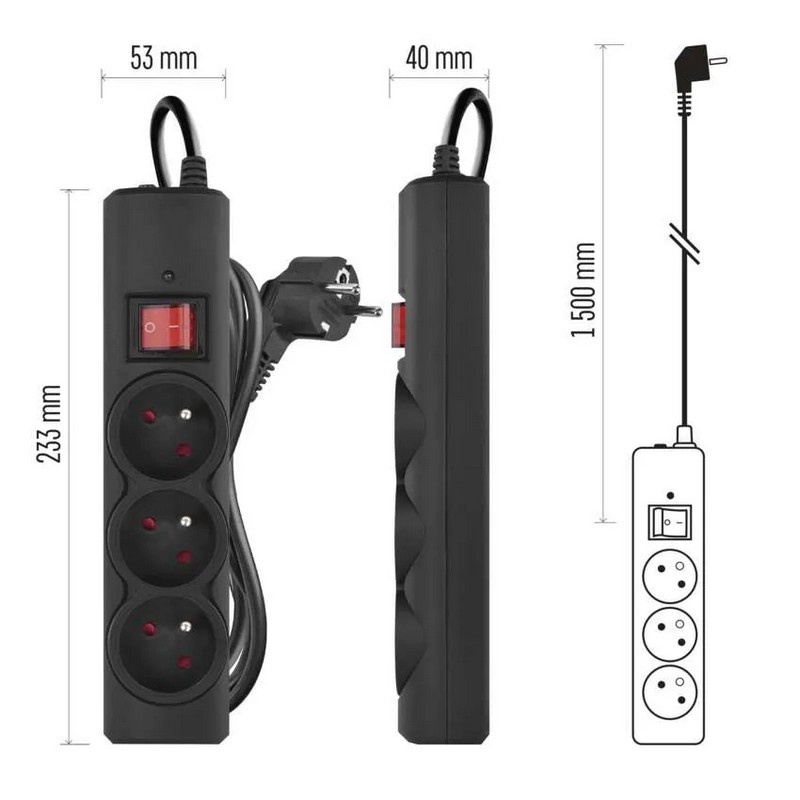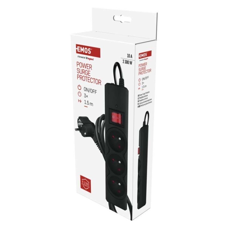 Listwa antyprzepięciowa EMOS P54014 w kolorze czarnym to kompaktowe i skuteczne zabezpieczenie urządzeń elektrycznych przed przepięciami oraz krótkotrwałymi skokami napięcia. Wyposażona w trzy gniazda 2P+PE i przewód o długości 1,5 m, zapewnia stabilne zasilanie komputerów, RTV, ładowarek i sprzętu biurowego.