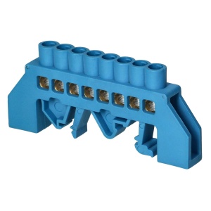 Listwa zaciskowa izolowana do przewodu neutralnego (niebieska). Stosowana w rozdzielniach elektrycznych ułatwia rozdział potencjałów i okablowania. Izolacja listwy zmniejsza ryzyko przypadkowego doziemienia. Nadaje się do montażu na szynę DIN lub płytę montażową.