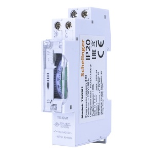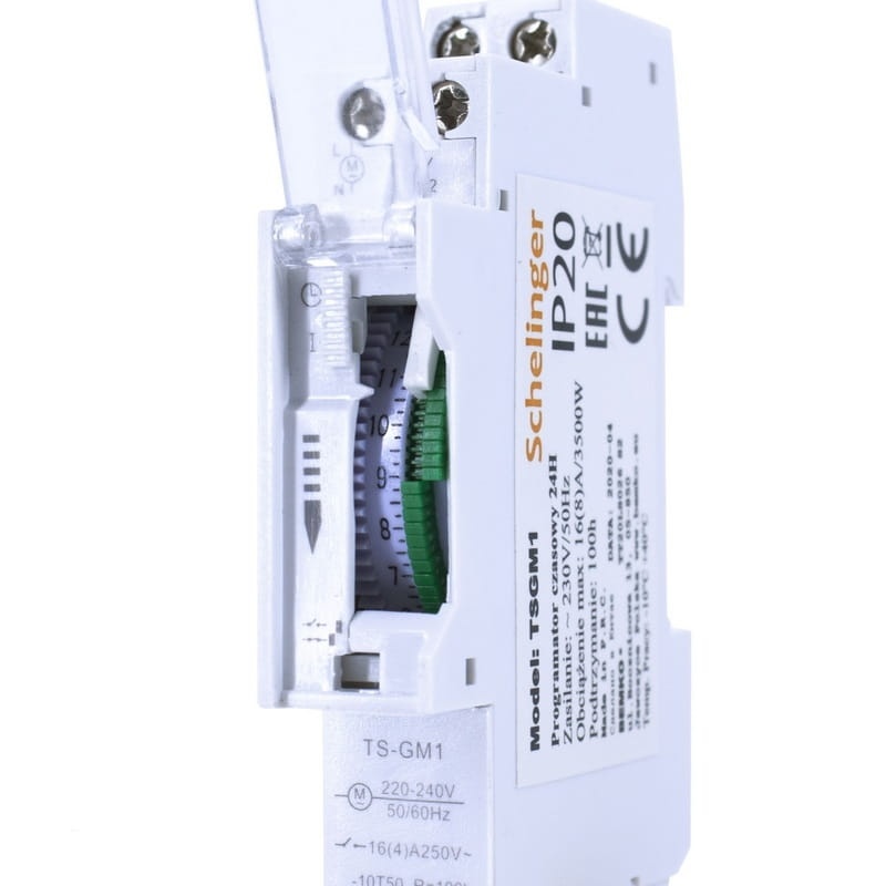TSGM1 to mechaniczny programator czasowy, działający w cyklu 24-godzinnym. Posiada 96 zapadek, aby ustawić godzinę wystarczy przesunąć jedną z nich (możliwe co 15 min). Szerokość urządzenia określa się jako jednomodułową (szyna DIN/TH/THS 35mm). Urządzenie takie jak TSGM1 służą przede wszystkim wygodzie użytkownika oraz pomagają ograniczyć zużycie energii. Z mechanicznego programatora TSGM1 skorzystasz załączając do niego urządzenia takie jak: podgrzewacz wody lub sprzęt RTV/AGD.