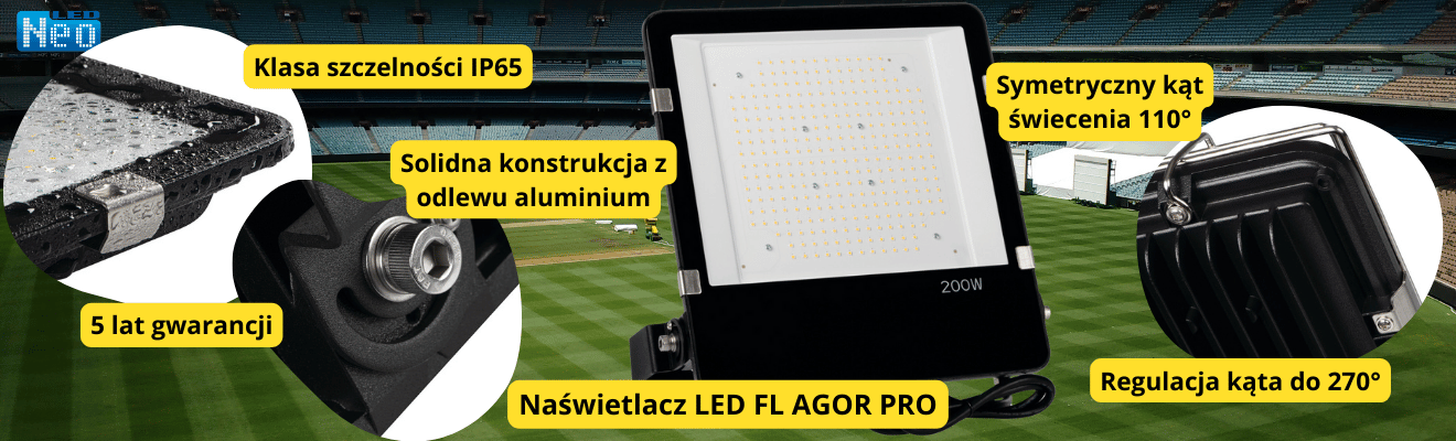 Naświetlacz LED Kanlux AGOR PRO 200W to rozwiązanie dla użytkowników poszukujących profesjonalnego i trwałego oświetlenia do obiektów przemysłowych, sportowych i magazynowych. Dzięki konstrukcji z odlewu aluminium oraz hartowanemu kloszowi oprawa skutecznie odprowadza ciepło, zapewniając stabilne parametry pracy przez długie lata. Symetryczny rozsył światła (110°) umożliwia precyzyjne oświetlenie powierzchni montażowych, placów czy elewacji. Oprawa przystosowana jest do montażu na ścianie lub suficie z możliwością regulacji kąta w pionie do 180°.