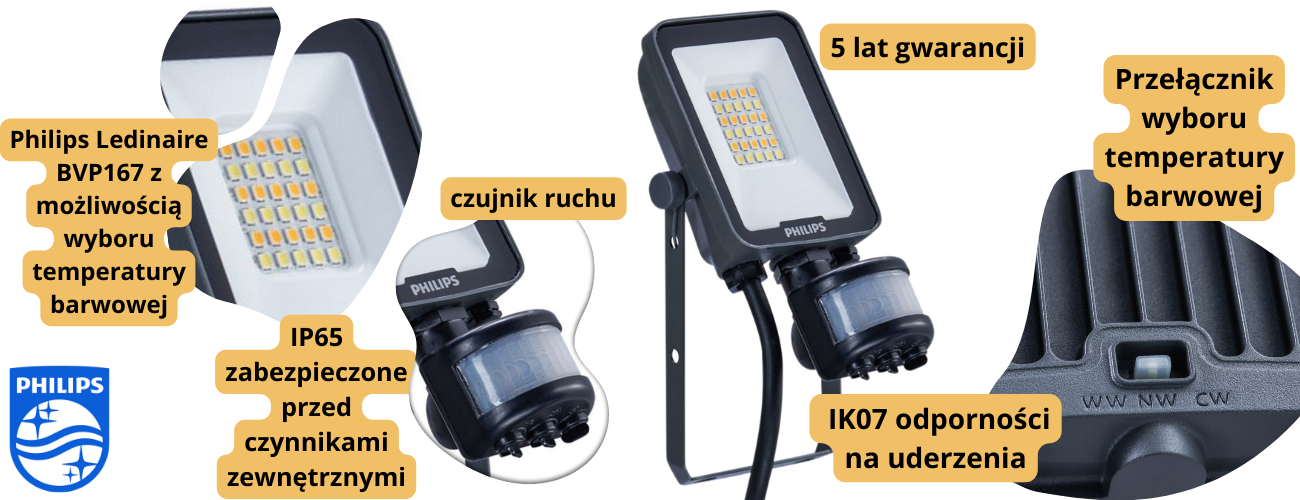 Naświetlacz LED PHILIPS Ledinaire All-in 10W BVP167 WW/NW/CW 1100/1200lm IP65 z czujnikiem ruchu PIR