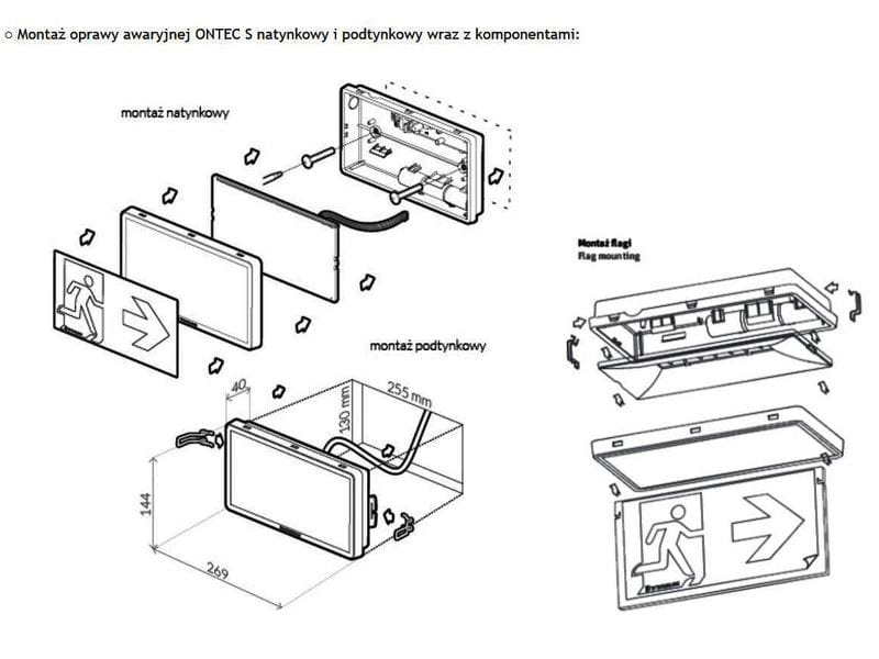 - możliwością wyznaczania kierunku ewakuacji - oprawa w zestawie posiada zestaw znaków ewakuacyjnych do naklejenia, z których można stworzyć różne kombinacje