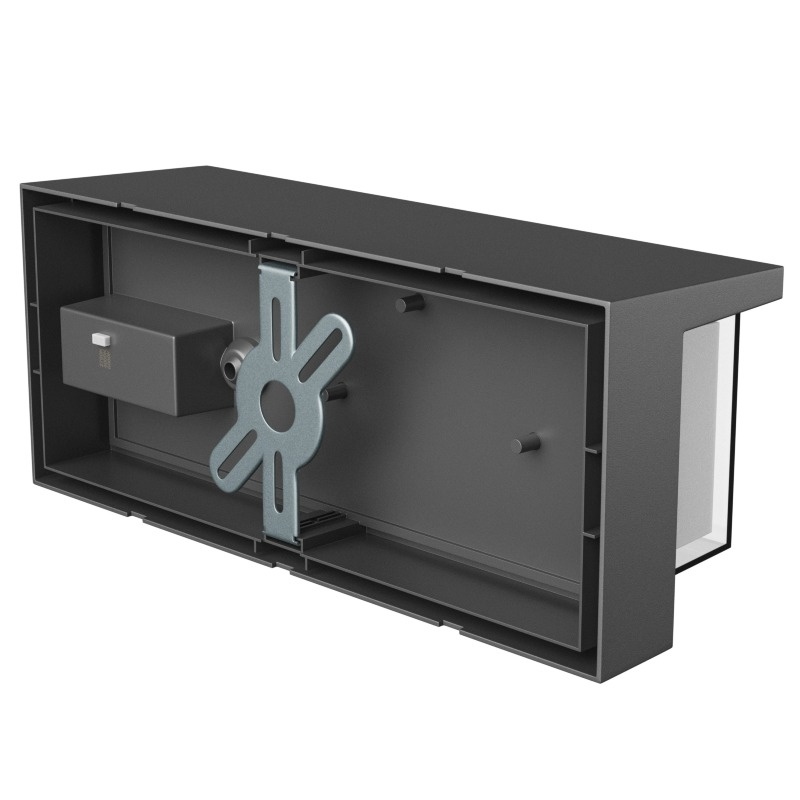Oprawa została wykonana z trwałego tworzywa sztucznego i zaprojektowana do pracy w wymagających warunkach zewnętrznych. Wysoka klasa szczelności IP65 chroni wnętrze oprawy przed kurzem oraz strumieniami wody, dzięki czemu sprawdza się w instalacjach elewacyjnych oraz ogrodowych.