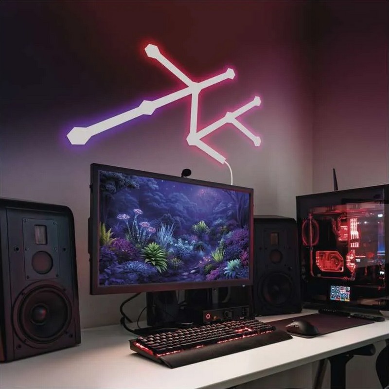Zestaw zawiera 9 segmentów świetlnych oraz łączniki, które umożliwiają tworzenie geometrycznych układów na ścianie. Dzięki temu możesz zaprojektować oświetlenie dokładnie tak, jak potrzebujesz – zarówno w formie prostych linii, jak i bardziej rozbudowanych wzorów.