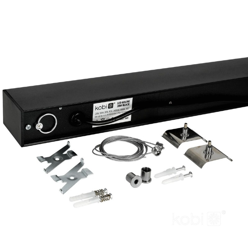 Model KOLINE K1 40W to nowoczesna oprawa liniowa LED o wysokiej skuteczności świetlnej i trwałości. Przeznaczona jest do montażu natynkowego lub zwieszanego (zestaw montażowy w komplecie). Dzięki długości 1200 mm i szerokiemu kątowi świecenia 105°, zapewnia równomierne, neutralnie białe oświetlenie (4000K).