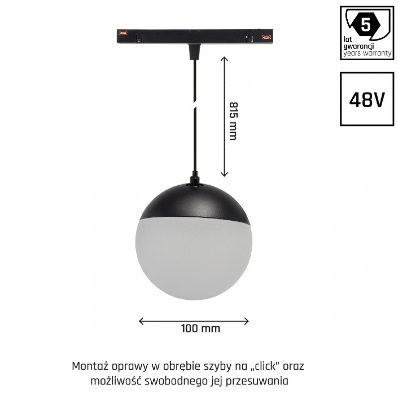 Oprawa zwis LED SYSTEM SHIFT GLOBE P 5W 3000K 550lm 165° na szynoprzewód 48V czarna