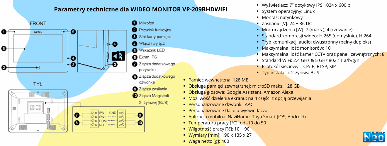 Zestaw wideodomofonowy dwużyłowy IPS HD WiFi dotykowy ekran czytnik RFiD czarny Zamel VP-209ICSB-B