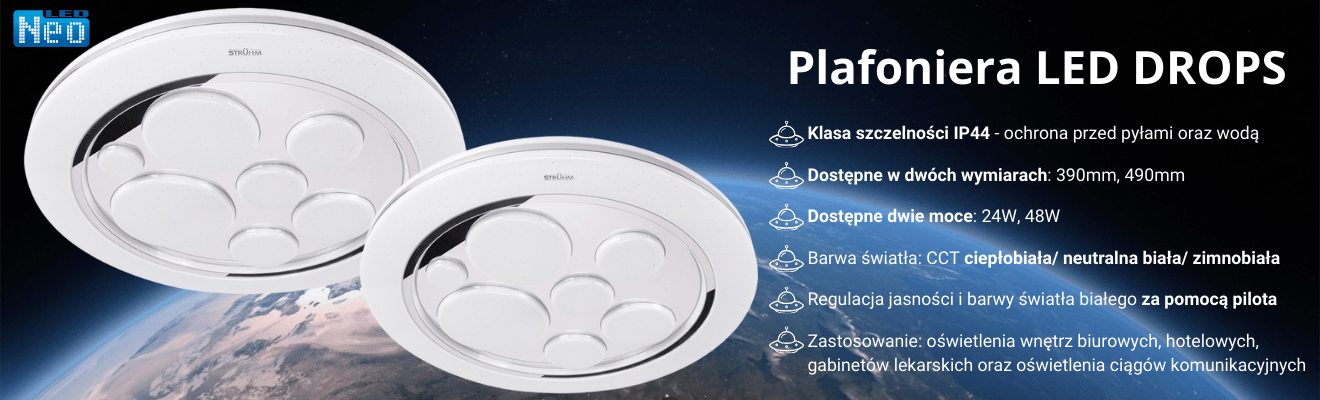 DROPS to okrągła oprawa LED przeznaczona do ogólnych celów oświetleniowych wewnątrz budynków np. kuchni, pokoi, biur. Lampa posiada wbudowane źródło światła LED o mocy 48W, strumieniu światła do 2860 lumenów, rozpiętości świetlnej od ciepłobiałej przez neutralną do zimnobiałej barwy. Sterowanie plafonierą odbywa się za pomocą dołączonego pilota. Niecodzienny wygląd plafoniery, wyróżnia ją na tle innych opraw. Główne źródło światła podzielone zostało na 7 mniejszych oraz świecący pas na średnicy.