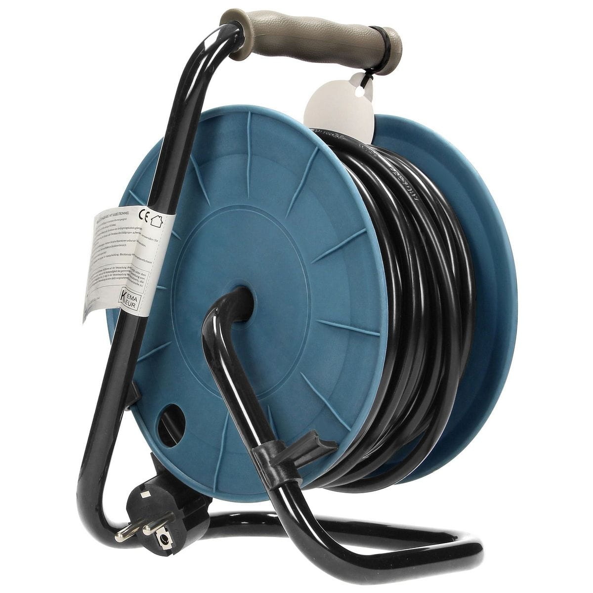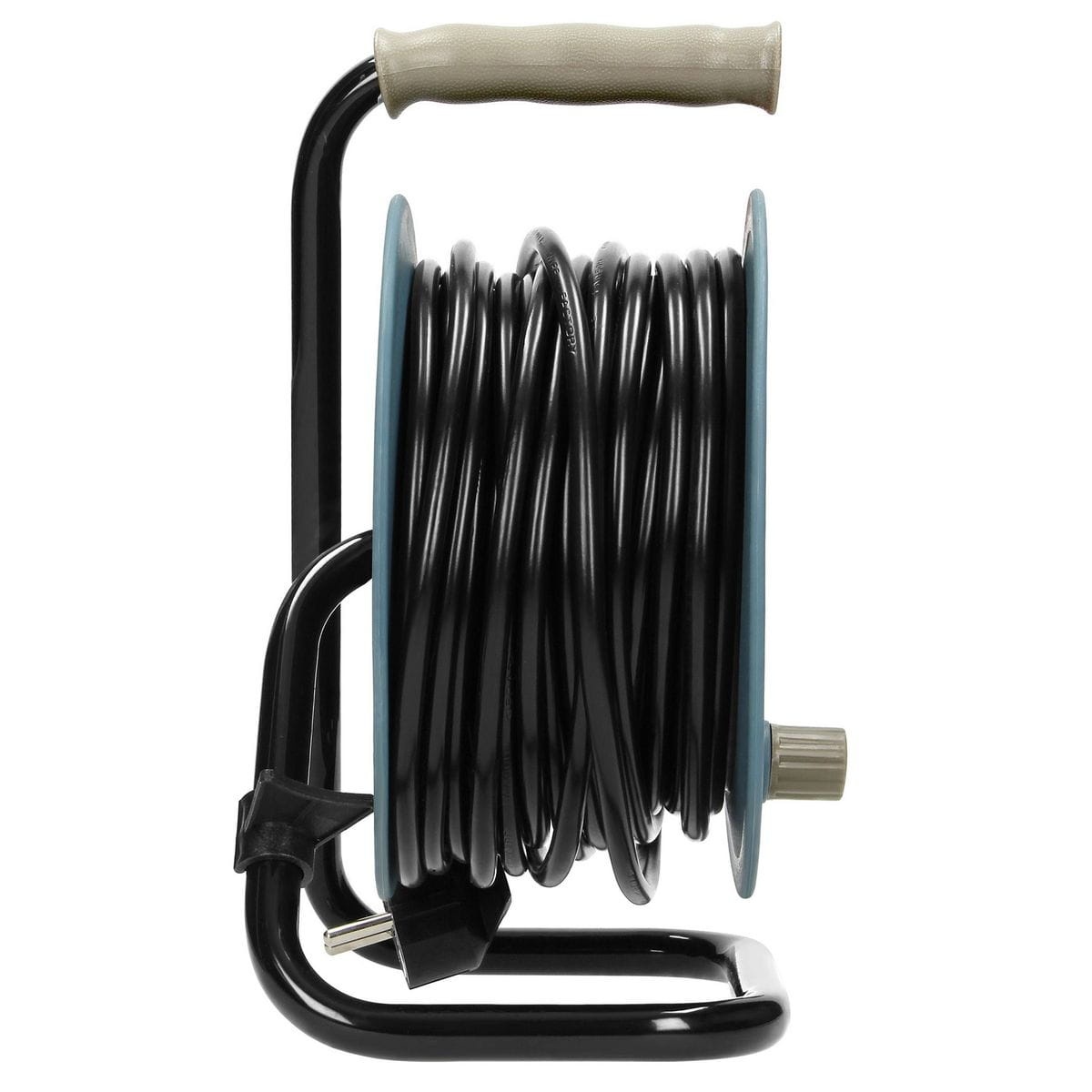 Przedłużacz bębnowy na zwijanym bębnie z metalowym stojakiem oraz zabezpieczeniem przeciążeniowym w postaci wyłącznika termicznego. Posiada cztery gniazda sieciowe z uziemieniem i przesłonami torów prądowych, wygodny uchwyt do przenoszenia oraz klips do zapięcia wtyczki. Małogabarytowa obudowa pozwala na wygodne użytkowanie oraz przechowywanie w domu, na działce, w biurze itp. Wyposażony w uchwyt korbowy do zwijania kabla oraz blokadę przypadkowego rozwinięcia. Dostępne kolory: szary, limonkowy, turkusowy.