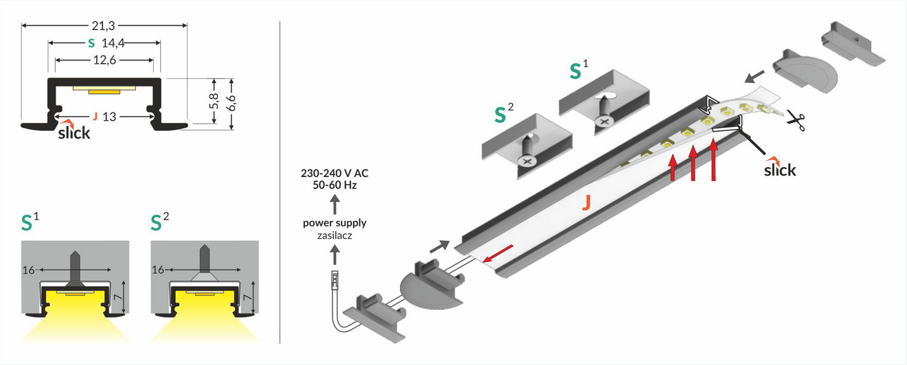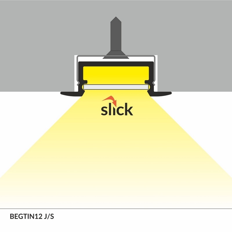 Konstrukcja profilu umożliwia montaż wpustowy, dzięki czemu idealnie sprawdza się w zabudowie meblowej, sufitach podwieszanych oraz elementach architektonicznych. Współpracuje z wsuwanym kloszem typu J, który pozwala uzyskać estetyczne rozproszenie światła i ochronę taśmy LED przed zabrudzeniem.