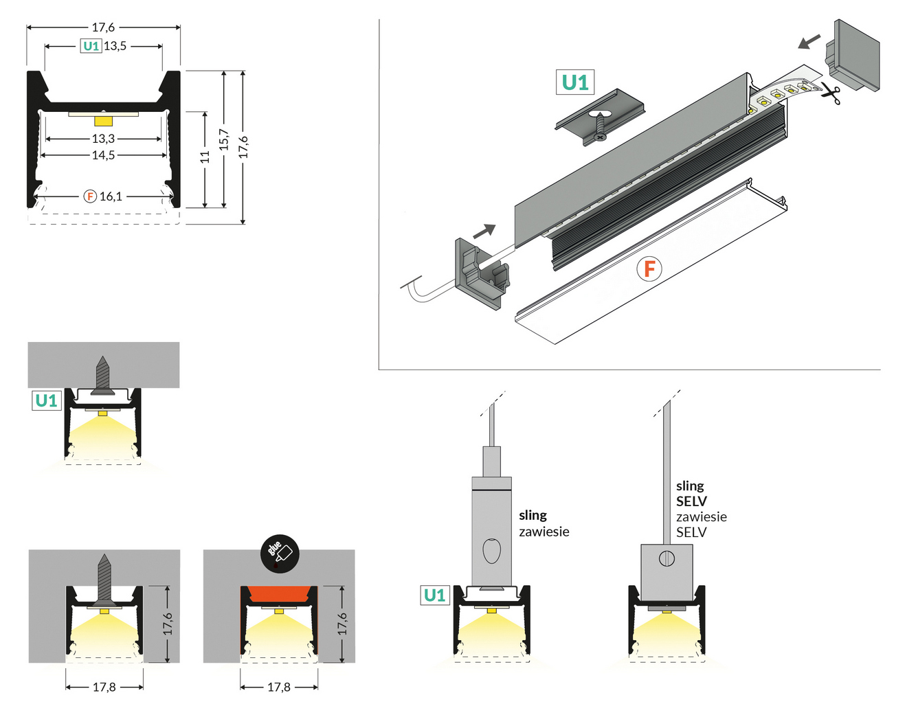 Wybierz profil HOOD14 F/U1 anodowany, jeśli szukasz nowoczesnego i funkcjonalnego rozwiązania do montażu taśm LED z ograniczeniem olśnienia i szerokimi możliwościami konfiguracji z kloszami oraz akcesoriami.