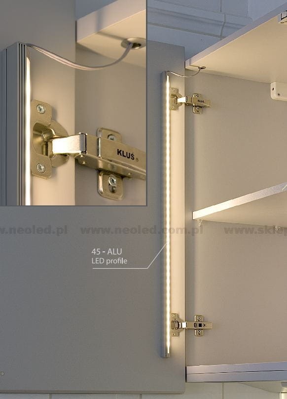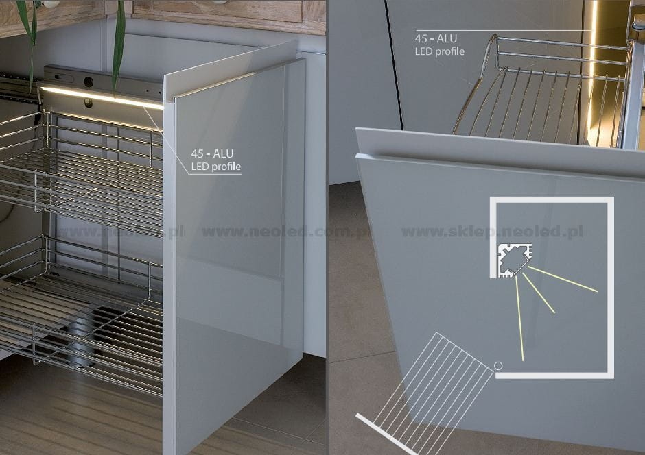 Profil 45 ALU to profil kątowy, wykonany z wysokogatunkowego aluminium anodowanego. Przeznaczony do taśm lub listw o szerokości nie większej niż 10,8mm. Do przesłonięcia diod służy przesłona K, KA-BIS, HS lub skupiająca typu S. Profil mocuje się do podłoża za pomocą taśmy dwustronnie klejącej lub mocowników. Do profilu nie jest dołączona przesłona!