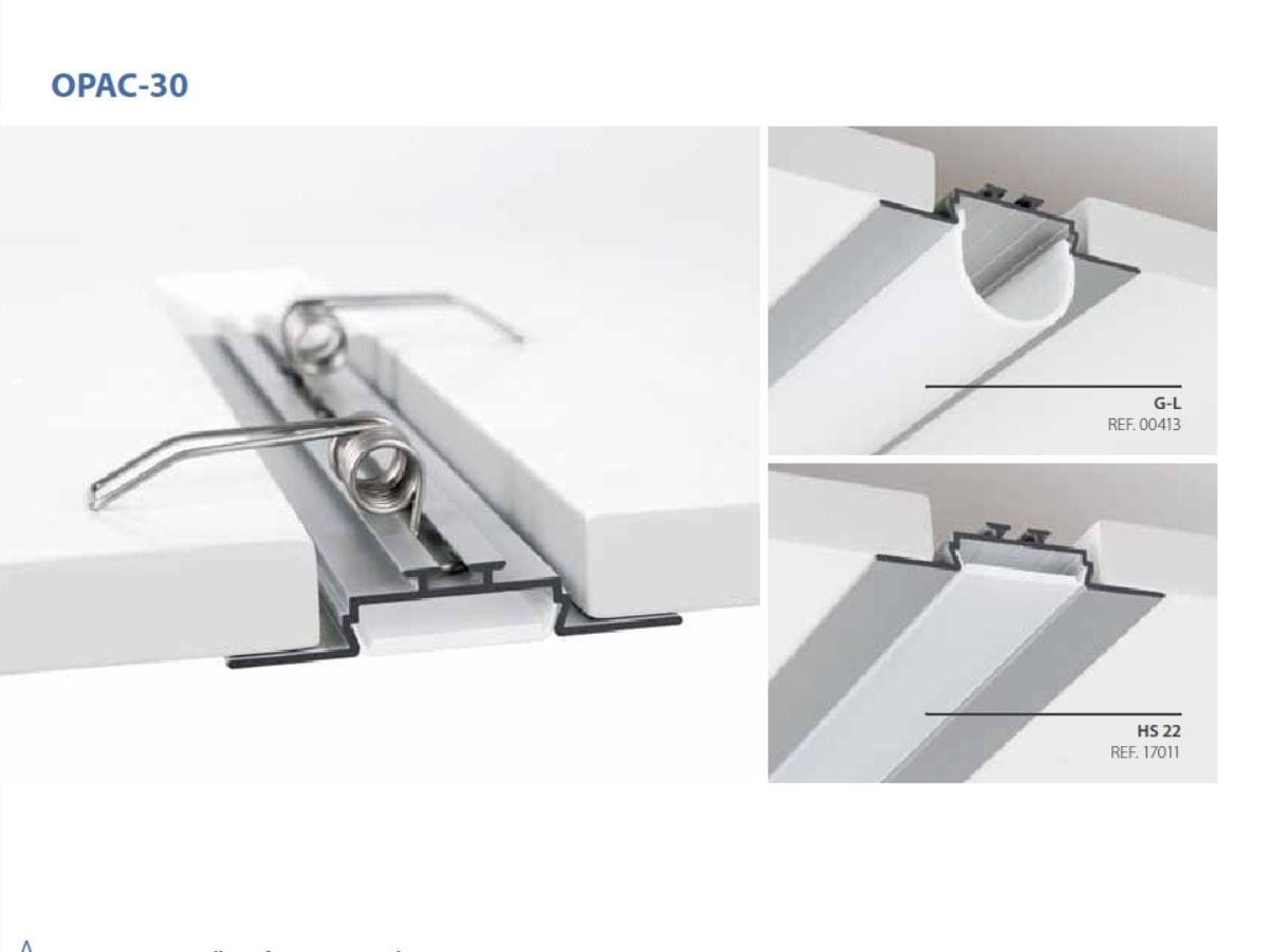 Profil OPAC-30 o niewielkim rozmiarze 52x9,5 mm mieści do 2 taśm lub listw LED. Służy do budowy płaskich opraw z dużymi kołnierzami osłonowymi. Przeznaczony jest do montażu w szczelinach wykonanych w płytach kartonowo-gipsowych. Ze względu na głębokość 9,5mm umożliwia montaż w płaszczyznach o niewielkiej grubości.