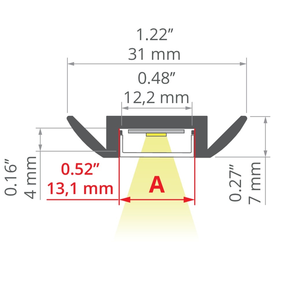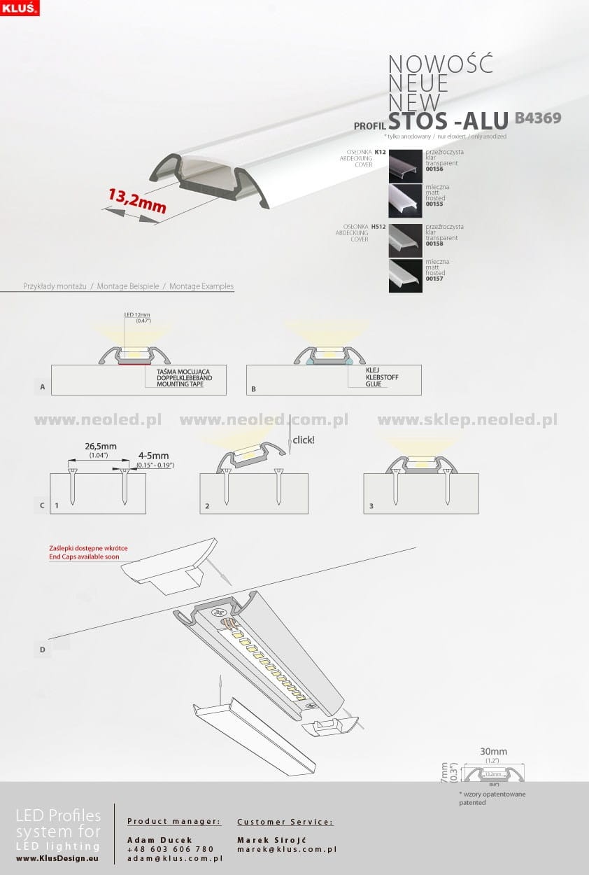 Profil STOS-ALU wykonany z wysokogatunkowego aluminium podwójnie anodowanego. Przeznaczony do taśm LED, pasków, listw o szerokości nie większej niż 12,8mm. Diody można przesłonić specjalną osłoną (mleczna, przezroczysta) typu K12 lub HS12. Do profilu nie jest dołączona przesłona! Jako akcesoria uzupełniające zalecane są zaślepki, które chronią taśmę przed wnikaniem ciał obcych, kurzu itp. Profil montuje się do podłoża za pomocą taśmy dwustronnie klejącej, klejów montażowych lub wkrętów.