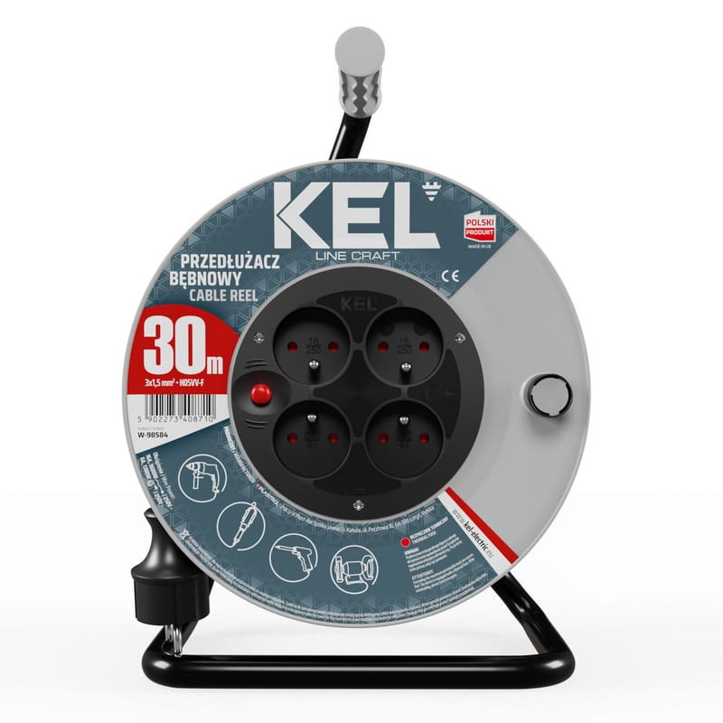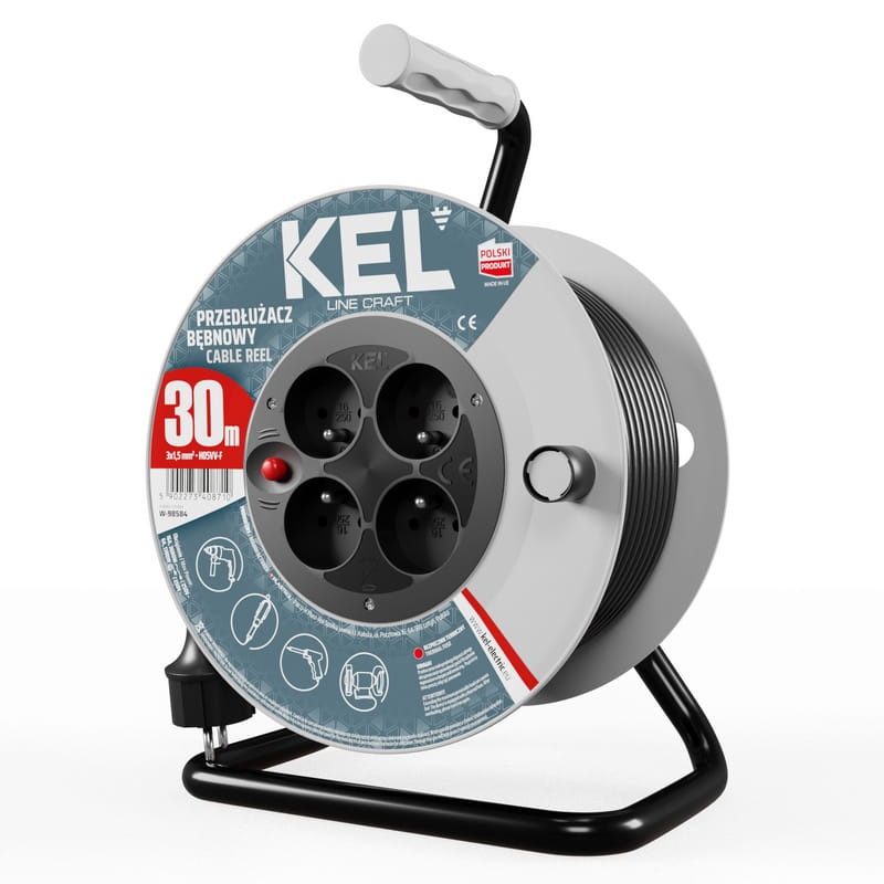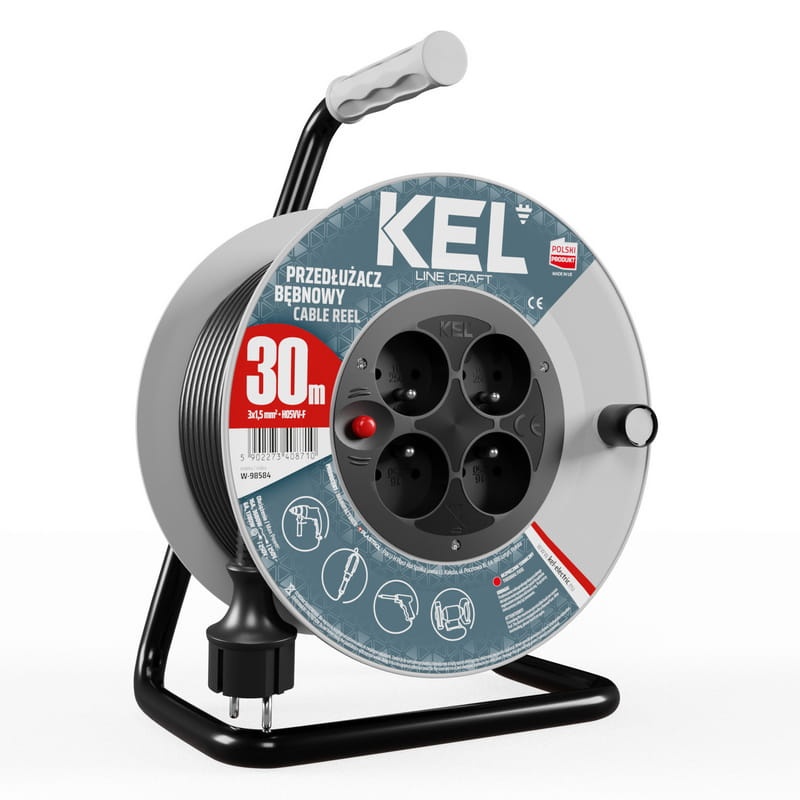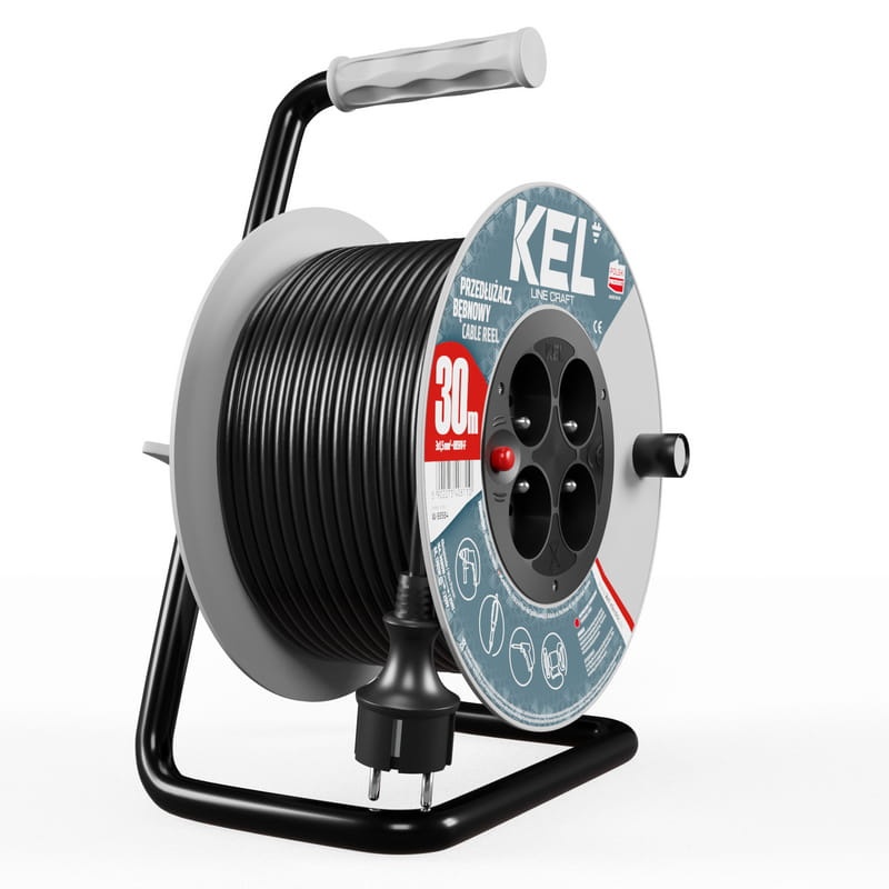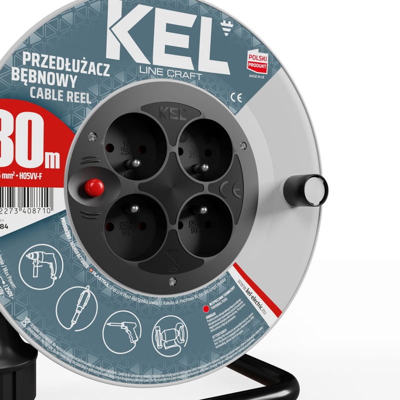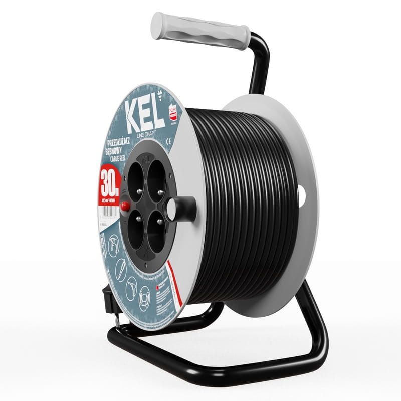 Przedłużacz bębnowy z wyłącznikiem termicznym. Posiada ergonomiczny uchwyt do rozwijania i zwijania kabla oraz blokadę bębna. Wyposażony został w 4-krotne gniazdo wtyczkowe z bolcem. Przedłużacz posiada przewód 3x1,5 mm o długości 30m. Przedłużacze linii KEL CRAFT doskonale sprawdzą się w warsztacie rzemieślniczym, jeśli Twoją pasją jest rzemiosło to jest to rozwiązanie dla Ciebie. Linia CRAFT w dobry sposób zabezpieczy energię elektryczną w Twoim domu, dzięki czemu można wykorzystać go do zasilania elektronarzędzi np. wiertarek, wyżymarek i pił tarczowych.